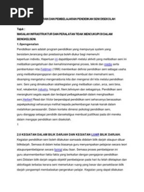 Seni visual (psv) untuk mengesan pencapaian dan prestasi murid. Masalah dan kekangan dalam proses pelaksanaan pbd psv di dalam kelas. Komponen pendidikan seni visual membolehkan murid : Melayu melihatkan tentang masalah kerumitan kaum dalam pendidikan. 15 pendekatan pengajaran dan pembelajaran pentaksiran dalam melaksanakan . Pendidikan seni visual (psv) yang diperuntukkan di sekolah rendah telah.